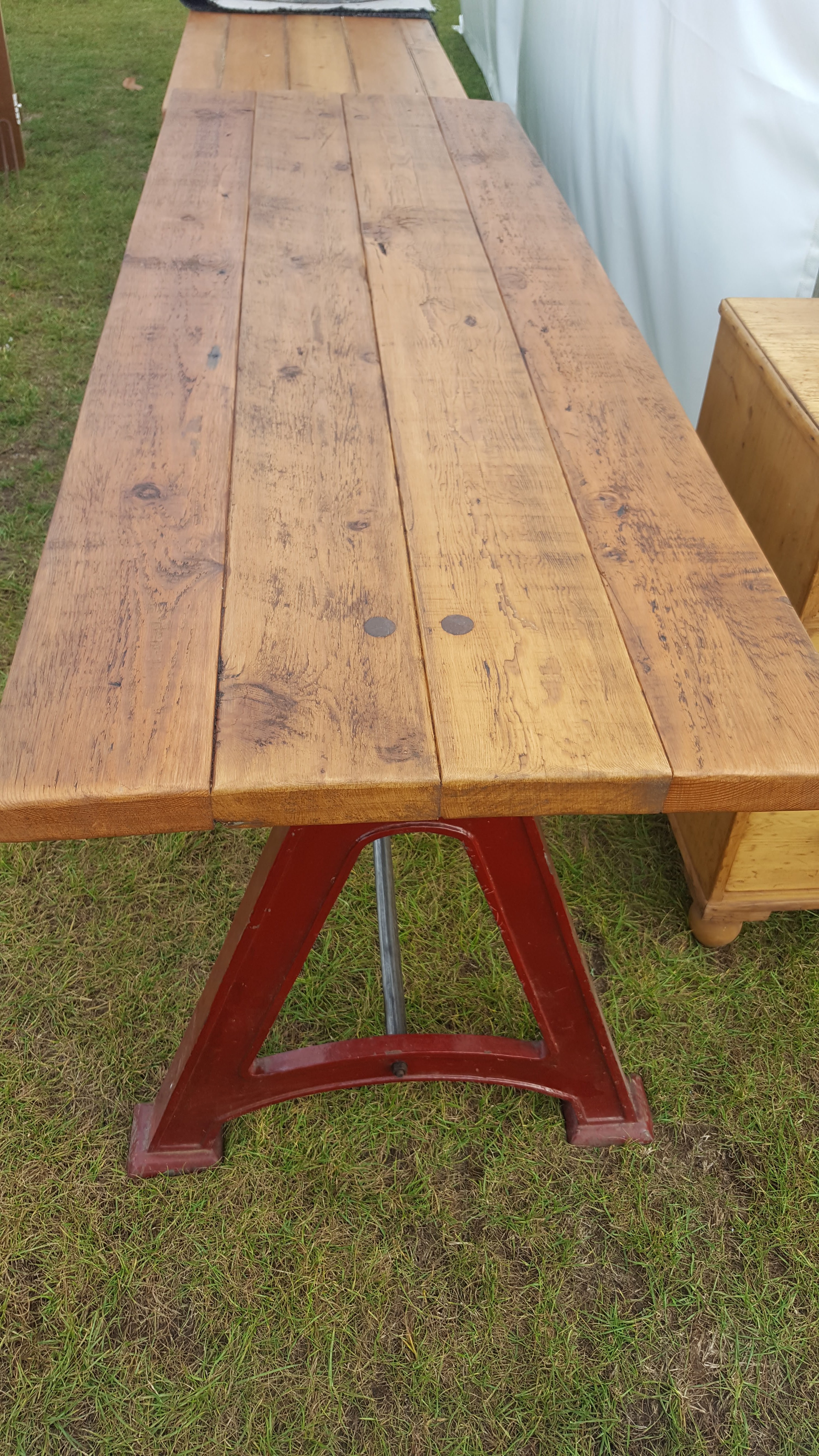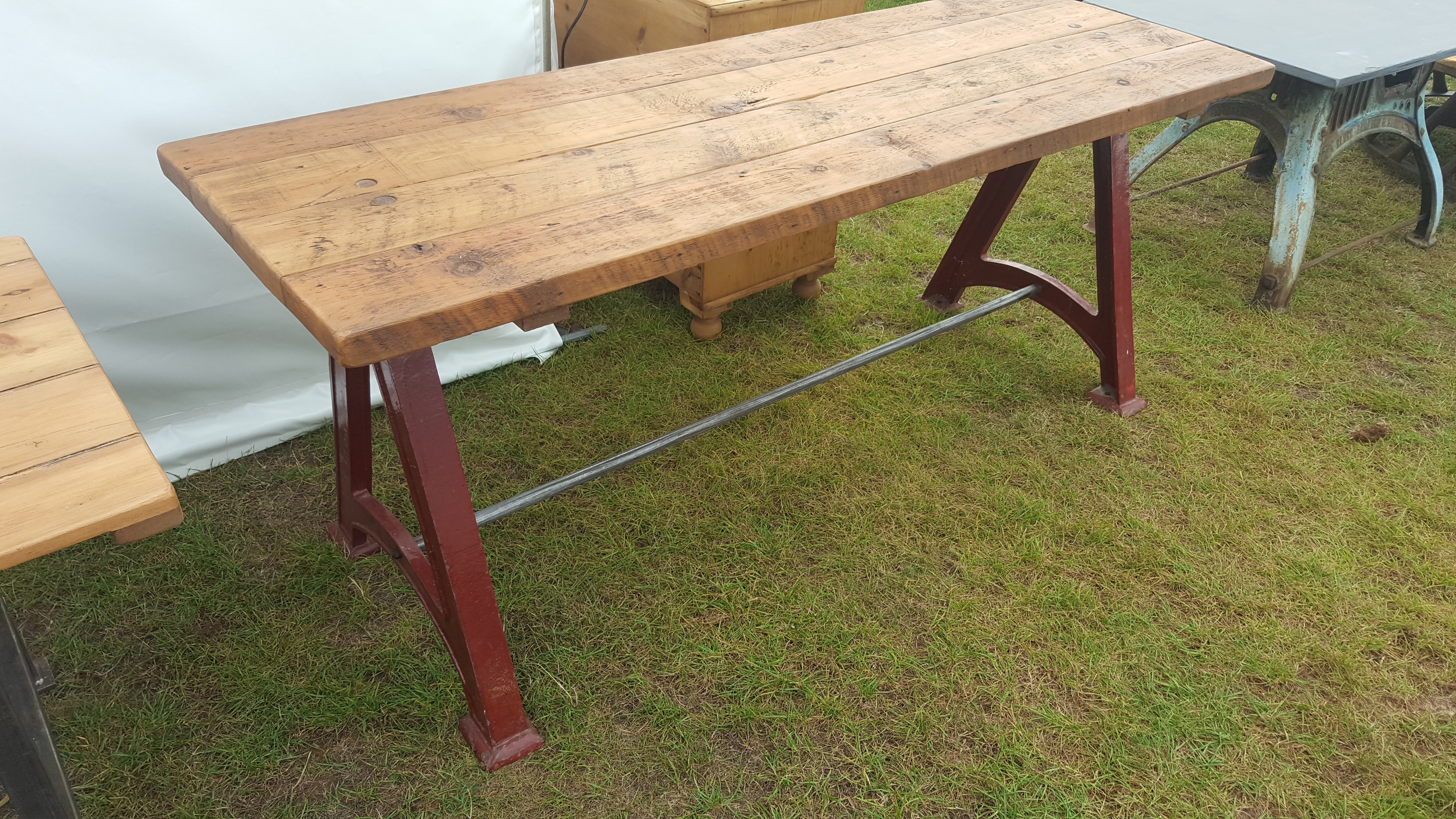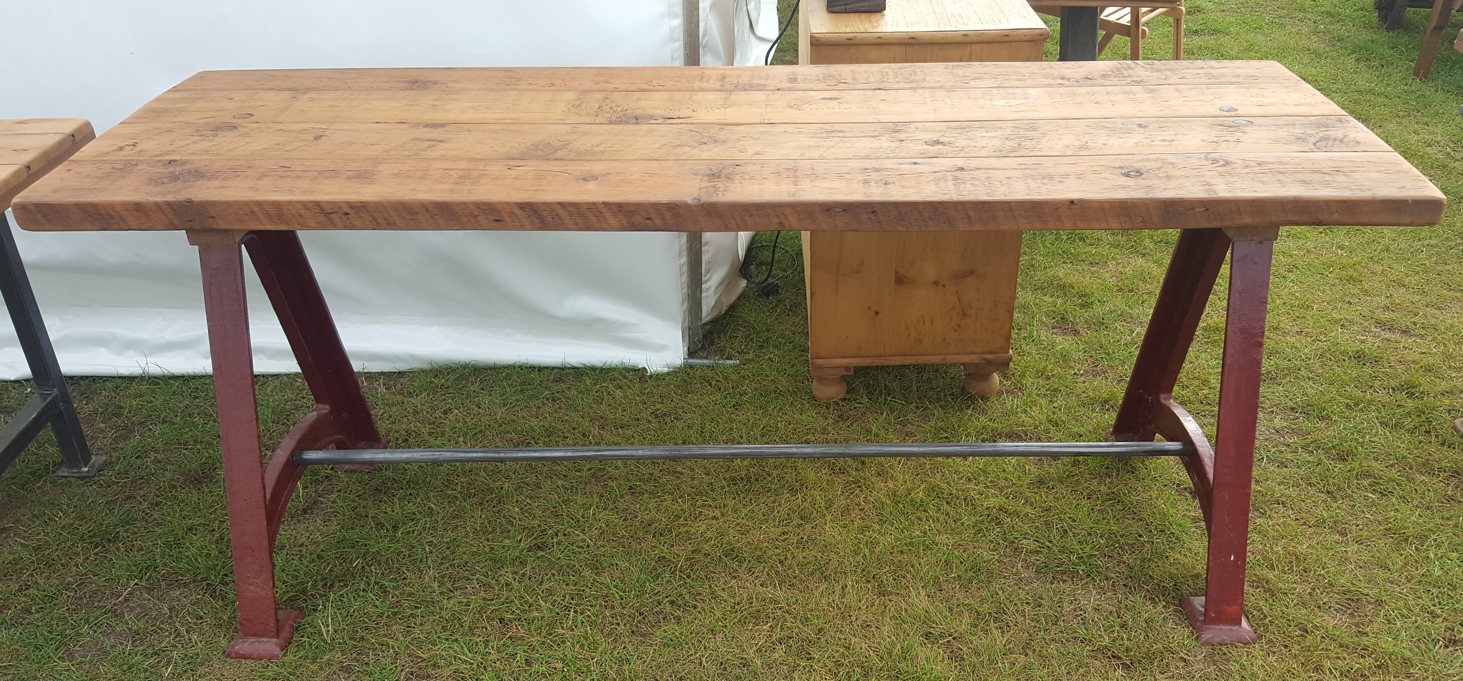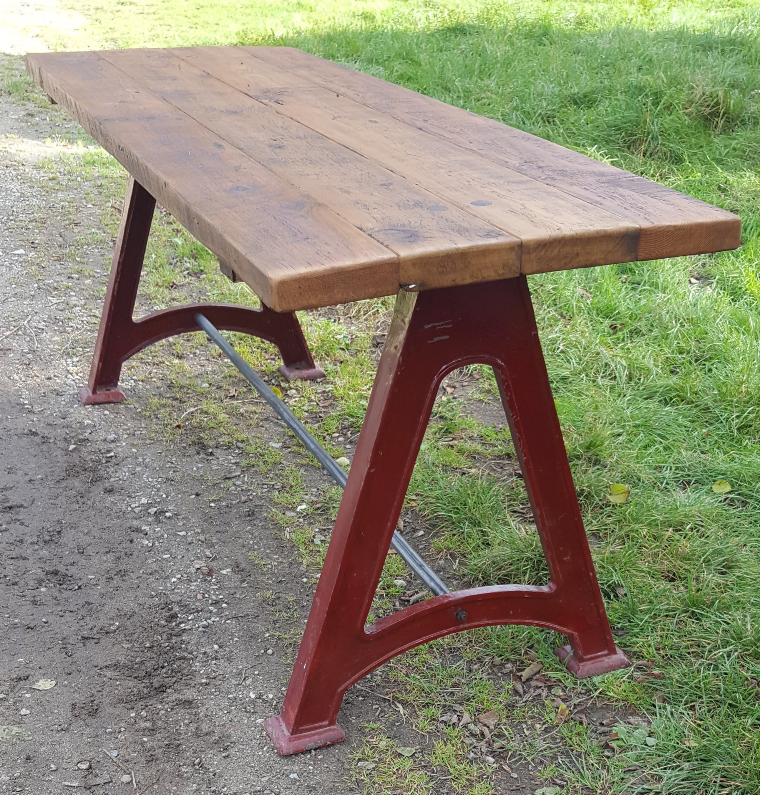 Original cast machine table legs with a reclaimed pine top.